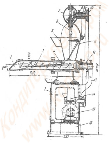 Машина состоит из станины 1 с кронштейном 13, смонтированной на чугунной плите 16, привода с червячным редуктором 14 и электродвигателем 15, корпуса 4 с вращающимся шнеком 3 я формующей матрицей 2, головки 7 со смонтированной внутри парой конических шестерен 8 и загрузочной воронки 5 со спиралью 11.