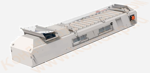 После моечной машины, чистая морковь загружается вручную между движущимеся плоскими упорами. Поперечные направляющие ленты перемещают морковь влево, и вправо по направляющей пластине. Конвейер с поперечными упорами перемещают морковь к площадке с вертикальным ножами, где обрезаются черенки и хвостики.