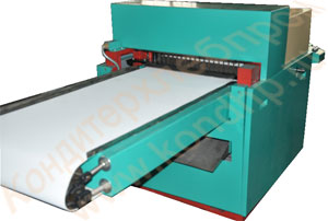 Конвейер подачи состоит из рамы, приводного и натяжного барабанов, отклоняющего ролика и двух раздвижных направляющих для сухарных плит.