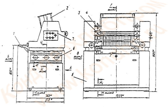 Машина формующая Р3-ШМФ-6: 1 - транспортер; 2 - бункер; 3 - барабан; 4 - фомующий вал; 5 - станина; 6 - механизм управления; 7 - пульт управления