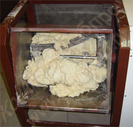 Машина месильная ММ-80 предназначена для использования в пельменных, кондитерских, пекарных производствах для приготовления теста пониженной влажности по ГОСТ 17327-88. В конструкции месильной машины ММ-80 применен горизонтальный принцип замеса теста, что позволяет уменьшить габариты и облегчить условия эксплуатации машины. Тестомес ММ-80 представляет сварную рамную конструкцию на которой смонтирована дежа с вращающейся внутри нее месильной рамкой Z-образного типа, электродвигателя и сочлененного с ним червячного редуктора, который приводит во вращение месильную рамку. Дежа тестомеса закрыватся крышкой. Управление тестомеса производится с электрического пульта, установленного справа от дежи. Электрическая схема позволяет переключать направление вращения месильной рамки на противоположное. На пульте управления установлены кнопки, отвечающие за вращение месильной рамки и сигнальная лампочка, указывающая наличие напряжения на электрическом вводе. За одну загрузку можно замесить до 30 кг теста. Машина проста по устройству и в обслуживании, неприхотлива к условиям эксплуатации и квалификации обслуживающего персонала.