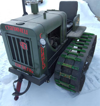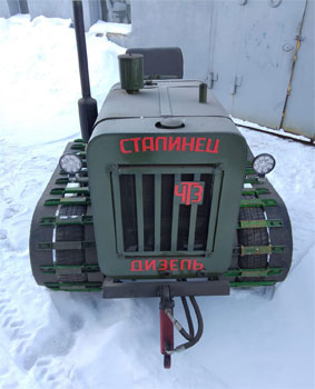 Мини-трактор «Сталинец» - данная модель трактора является неточной и уменьшенной копией легендарного трактора, производимого в довоенные годы и имеющего богатую историю, в том числе и на военной службе. Данная модель имеет бензиновый двигатель внутреннего сгорания мощностью 9-15 л. с., трансмиссия механическая раздельная на каждый борт, управление осуществляется двумя рычагами, которые для удобства расположены по краям сиденья. Данная модель используется для уборки снега на закрытых площадках и не предназначена для выезда на дороги общего пользования. В комплекте с трактором поставляется отвал с гидроприводом, имеется насос НШ и распределитель. Для работы в ночное время есть головное освещение. Ходовая часть представляет собой: 4 колеса R13 и 2 гусеницы, состоящие из 2-х лент и грунтозацепов. Конструкция трактора очень простая, все узлы и агрегаты имеются в свободной продаже и в случае ремонта у Потребителя не возникнет проблем с поиском нужных ему запчастей. Характеристики: вес трактора 450 кг, габаритные размеры 2400 мм х 1450 мм х 1600 мм. Трактор максимально простой в управлении, с ним справится даже подросток.