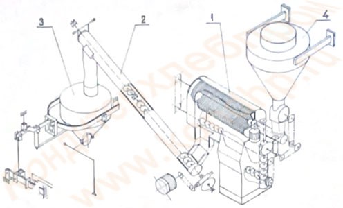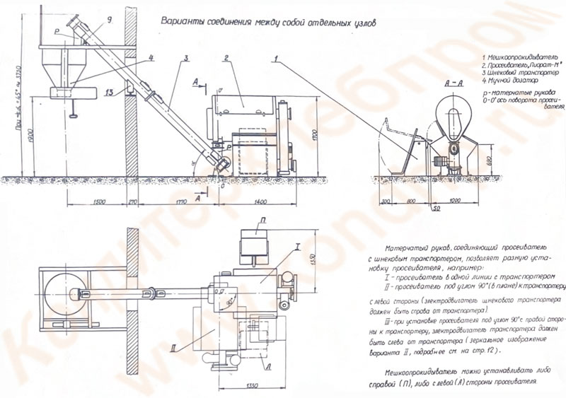 При использовании агрегата на хлебозаводах с бестарным хранением муки предусмотрена возможность привода шлюзового затвора приемного бункера 4 от привода просеивателя. В этом случае мука из приемного бункера через шлюзовой затвор попадает на верхний шнек просеивателя, а оттуда — в ситовой барабан. Далее схема подачи муки не меняется.