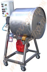 Массажер для мяса вакуумный имеет вращающийся на двух опорных роликах цилиндрический бункер, загрузка и выгрузка продукта осуществляется с торца, а для заливки и слива рассола на цилиндрической части бункера имеется специальное отверстие.