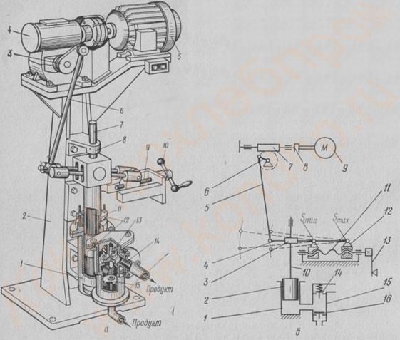 (рис. 1.б). заключается в следующем. Электродвигатель 9 через муфту 8 приводит в движение червячный редуктор 7. Выходной вал редуктора имеет кривошип 6, который посредством шатуна 5 приводит в колебательное движение рычаг 4, поворачивающийся относительно опоры, установленной на подвижной гайке 12. Положение гайки 12 можно изменять вращением винта 11 с помощью рукоятки 13 (тонкой линией показано крайнее положение гайки). При изменении положения гайки 12 ползун 3, сквозь который свободно проходит рычаг 4, может совершать большее или меньшее перемещение в вертикальной плоскости (Smin и Smax — соответственно минимально и максимально возможный ход плунжера). С ползуном жестко связаны шток 10 и плунжер 2, скользящий в цилиндре 1. При движении плунжера вверх происходит засасывание жидкости через клапан 16, а при обратном движении плунжера жидкость перетекает через нагнетательный клапан 14. Клапаны располагаются в клапанной коробке 15, которая подсоединяется к патрубкам продуктового трубопровода.