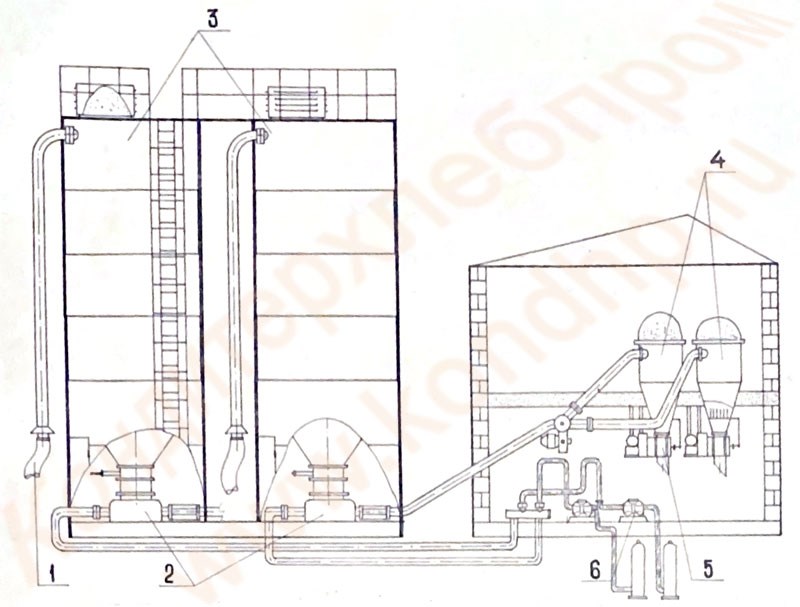 Мука, доставленная на хлебозавод автомуковозом, взвешивается на автомобильных весах, а затем при помощи компрессорной станции автомуковоза перекачивается через разгрузочный рукав 1 и мукопровод в силос 3. Из силоса мука поступает самотеком в роторный питатель 2, откуда сжатым воздухом, поступающим по воздуховоду от воздуховки 6, направляется по трубопроводу в один из приемных бункеров 4.